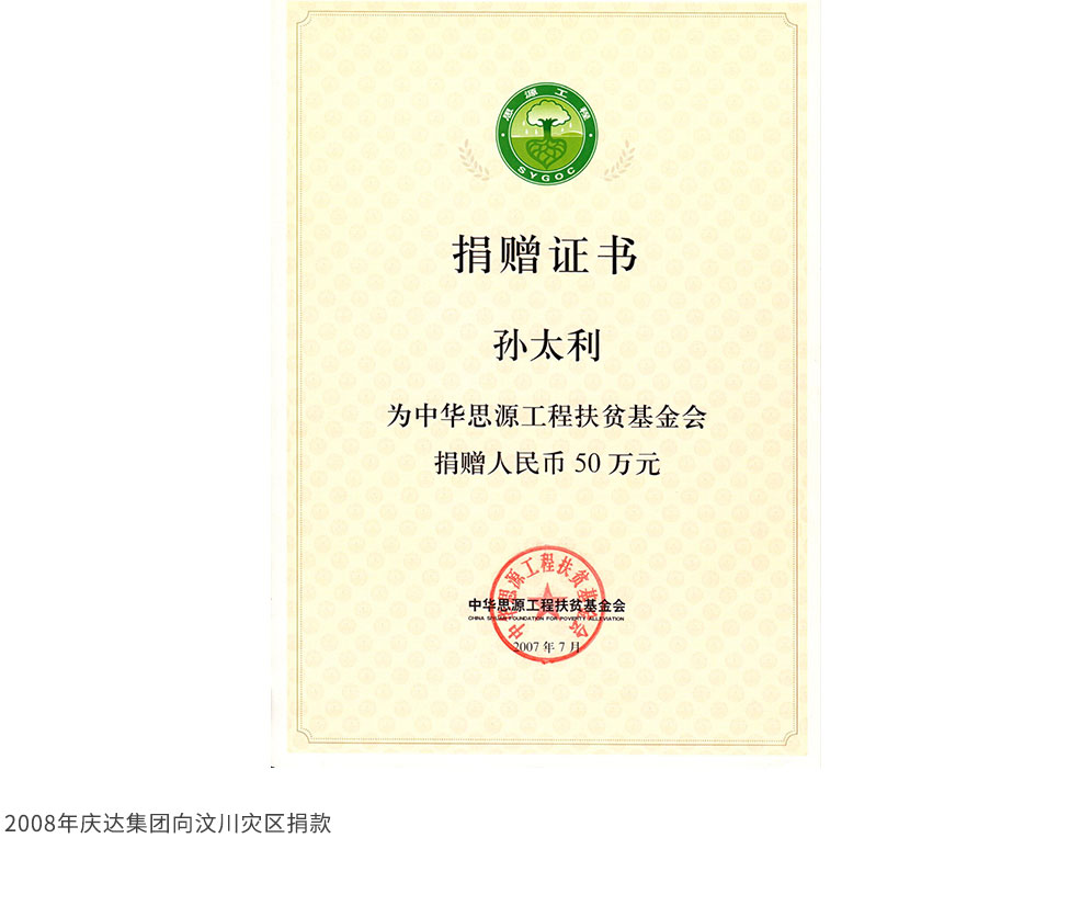 孫太利董事長是中華思源工程扶貧基金會發起人之一,第一屆理事會理事,現為名譽理事。他積極響應民建中央號召,依托中華思源工程扶貧基金會,為廣大民建會員及有關愛心人士,搭建公益平臺。